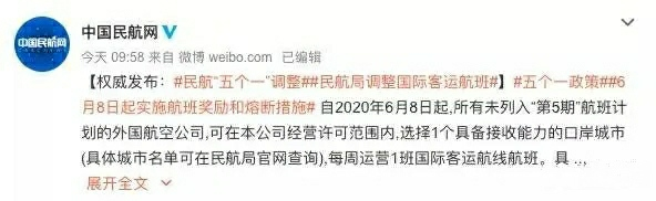 6月5日民航局官网刊登通知称,6月8日起,所有未列入“第5期”航班计划的外国航空公司,可选择一个具备接收能力的口岸城市,每周运营一班国际客运航线航班。各航空公司可向民航局申请运行至10月24日的航班预先飞行计划。